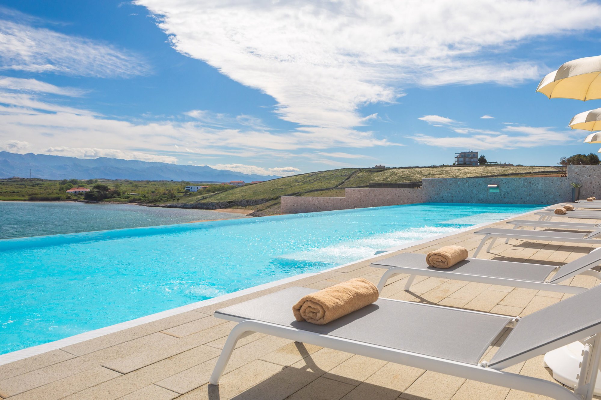 Pool, beach, family fun, luxury – and even more luxury – combined with dramatic rocks, lush greenery and breathtaking views over the turquoise Adriatic Sea. That is exactly what awaits you at Aminess Avalona Camping Resort. Located right by the sea in Povljana on the island of Pag, the resort is easily accessible from the mainland by bridge or ferry.